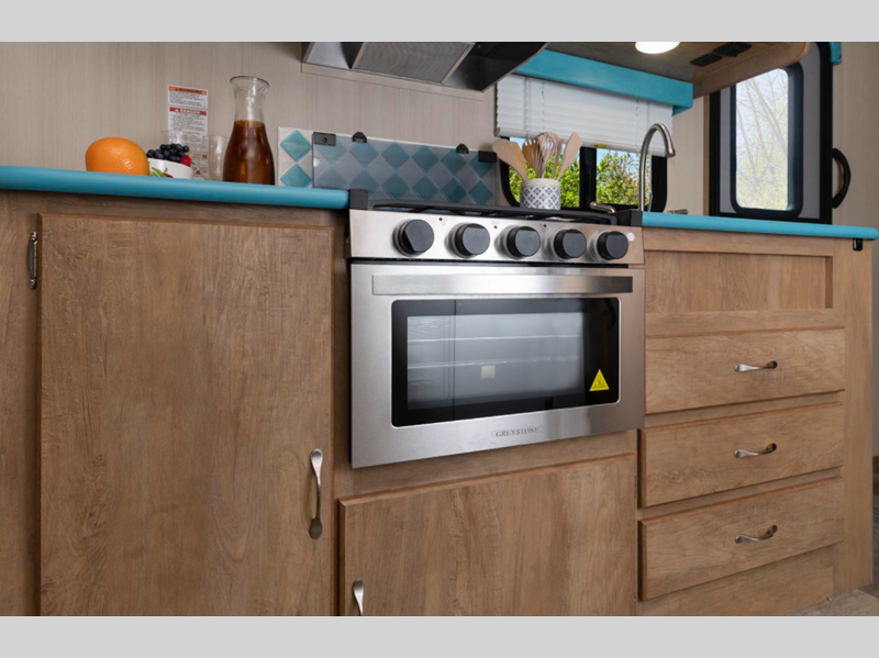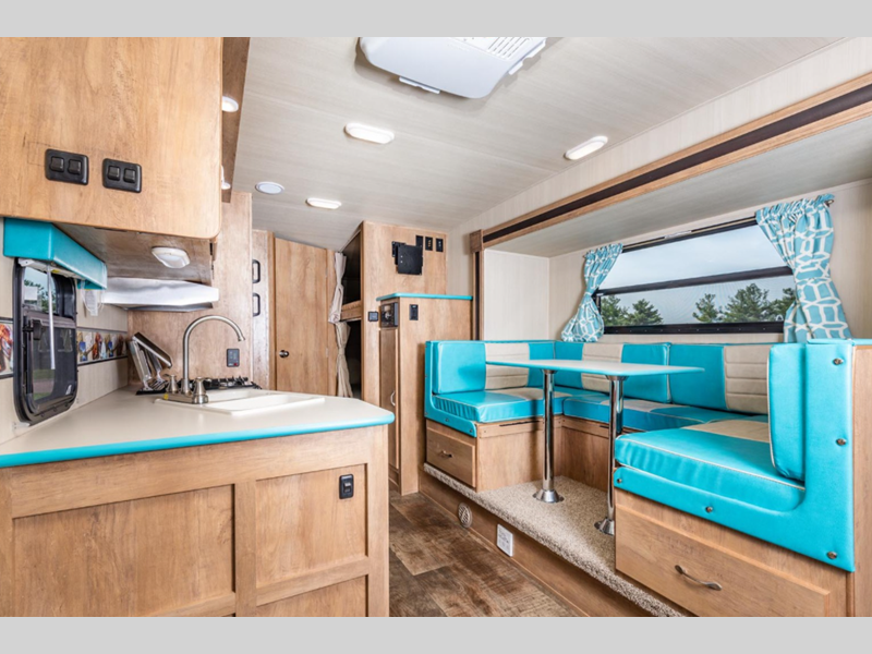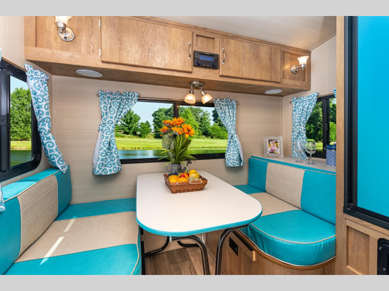 Since these models are constructed with laminated fiberglass sidewalls with an exterior layer of Azdel, they are both lightweight and durable. The easy-lube axles will provide smooth towing, and the hitch light will allow you to get on the road in no-time. Inside, you'll love the vintage dinette and vintage cabinet doors, plus high-performance vinyl flooring and cream countertops with self-edging. There are multiple USB ports to keep your electronics charged and ready to go, plus a convenience switch panel with a tank monitor to access your trailers functions in one easy location.